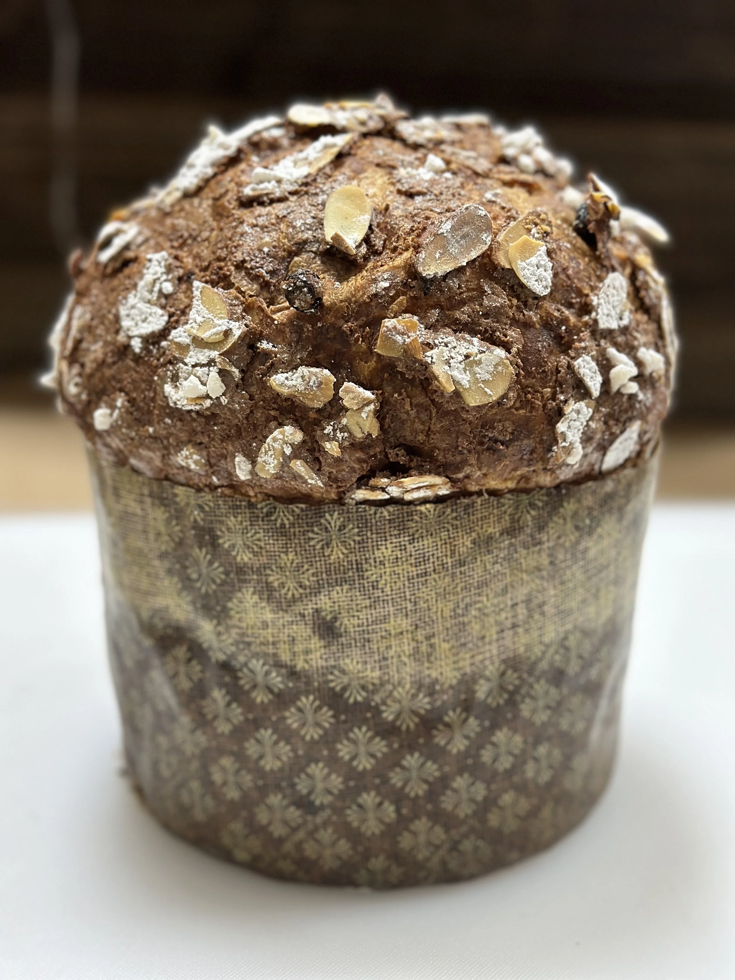 Panettone is a 60 hour process Italian holiday bread, naturally leavened without yeast. Ours is baked with all natural ingredients: butter, honey, vanilla bean, egg yolks, white chocolate, candied orange, and rum-plumped raisins. Panettone has a one-month shelf life due to its all-natural starter.