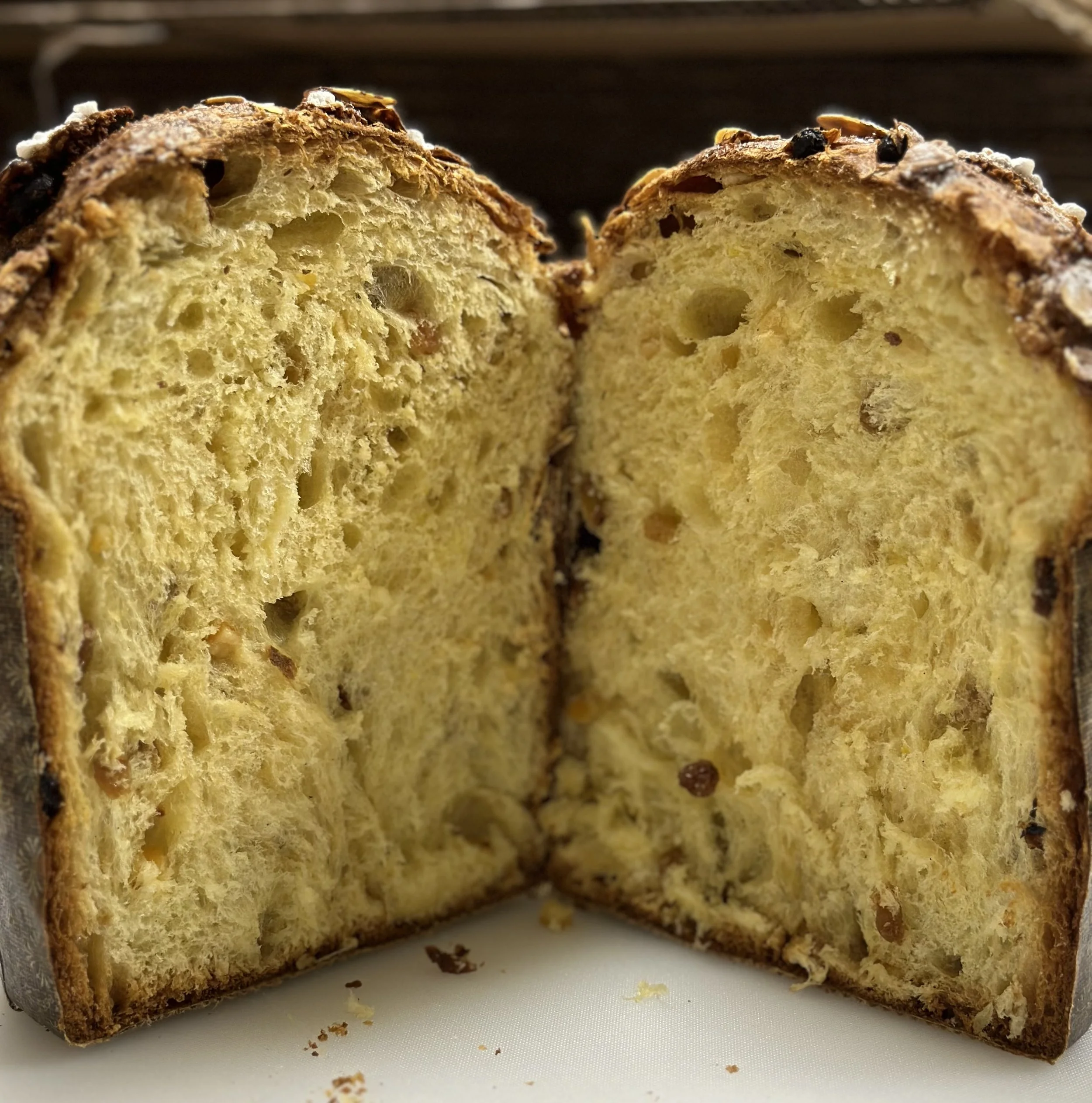 Panettone is a 60 hour process Italian holiday bread, naturally leavened without yeast. Ours is baked with all natural ingredients: butter, honey, vanilla bean, egg yolks, white chocolate, and pistachios. Panettone has a one-month shelf life due to its all-natural starter.